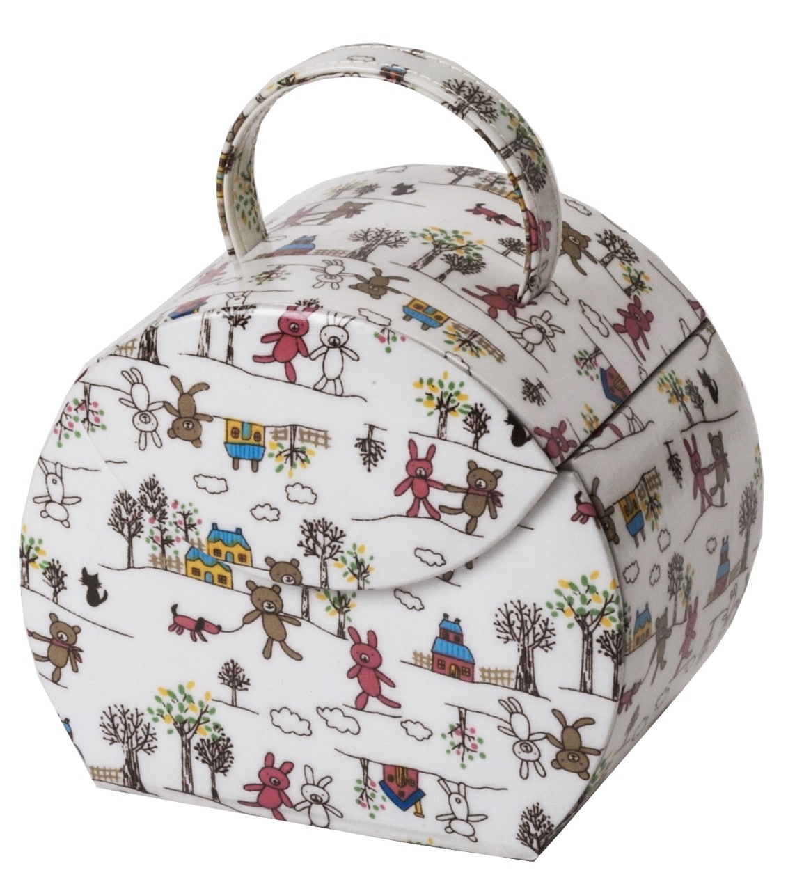 Nydeleg smykkeskrin som kan bærast som ei veska. Herleg kosedyrmotiv på mjuk tekstil. Uttrekkbar skuff til esker og større smykke, og små rom til ringar og øyrepynt. Med magnetlås og speil på innsida. Kjekk gåve til den som vil ta godt vare på smykkene sine.