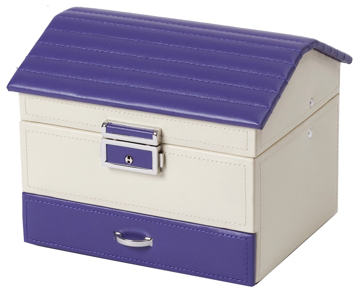 Stilig smykkeskrin i lilla og beige med nydeleg tekstil med blomar på innsida. Stort rom til esker og større smykker, små rom til ringar og øyrepynt. Eit smykkeskrin til den kvalitetsbevisste som vil ta godt vare på pynten sin.